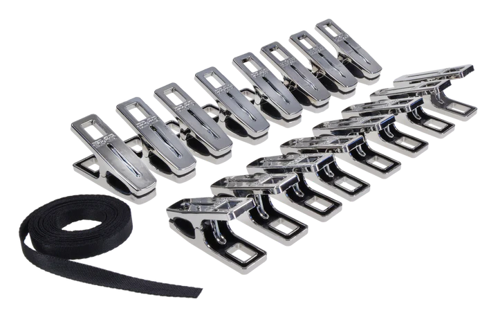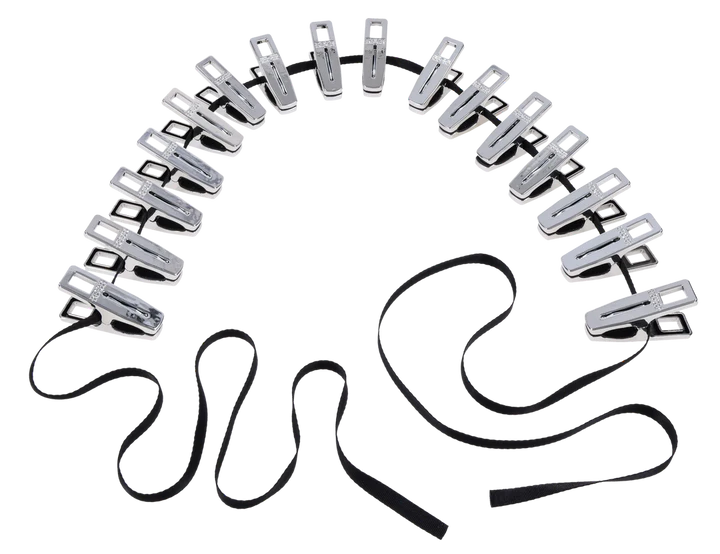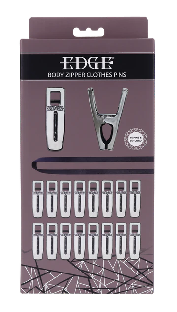 Edge Body Zipper Clothes Pins by Sportsheets: Submit to sensation. Suffer in sequence. The Edge® Body Zipper Clothes Pins turn control into artful cruelty. Sixteen silver-plated clamps await your command, ready to fasten to flesh and link through a heavy-duty 96-inch flat cord. Thread the cord through each clamp, then pull to zip, each motion tugging at the body in a slow, merciless wave of pressure that blurs the line between pain and pleasure. Silicone-lined interiors ensure a secure bite that holds until release. Finished in polished silver-plating with the Edge logo engraved on both sides, this set delivers portable, precision-built domination. Travel-friendly and ready for any scene.