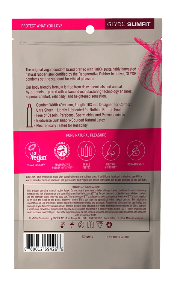 Slimfit Condoms 12 Pack by Glyde: Wearing the correct condom size is the key to reliable performance and pleasure - for both partners. Tailored for comfort, SLIMFIT provides a snugger, tighter fit at 49mm.