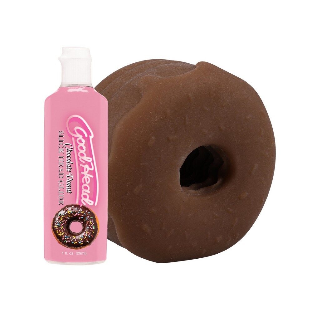 Good Head Chocolate Donut Blowjob Set by Doc Johnson: No need to run to the corner shop! This adorable open-ended donut stroker has a tight, textured interior made from ULTRASKYN, for the ultimate feel. It includes a 1 fl. oz. bottle of Chocolate Donut-flavored GoodHead Slick Head and ULTRASKYN Refresh Powder to keep it fresh and ready.