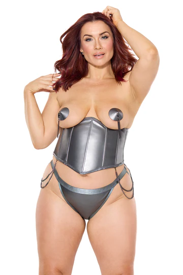 Gunmetal Glam Waist Cincher by Coquette: Enhance your waistline with our Gunmetal Glam Waist Cincher. The metallic pleather and removable metal chains create a unique, versatile style. The boned seams provide structure while the adjustable back straps allow for a perfect fit. Elevate any outfit with this chic and functional accessory.
