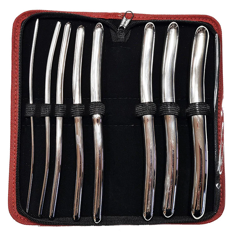 Stainless Steel 8 Piece Hegar Dilator Set by Rouge: Stainless Steel 8-piece Hegar Dilator Set comes complete with case. Each double-ended dilator sound gradually increases in size on both ends. For both beginners and advanced. Insertable length: 10 cm on each side. Total Length: 20.3cm ( 8 inches) Overall Diameter: 3.5mm, 4mm, 5mm, 6mm, 7mm, 8mm, 9mm, 10mm, 11mm, 12mm, 13mm, 14mm, 15mm, 16mm, 17mm, 18mm.