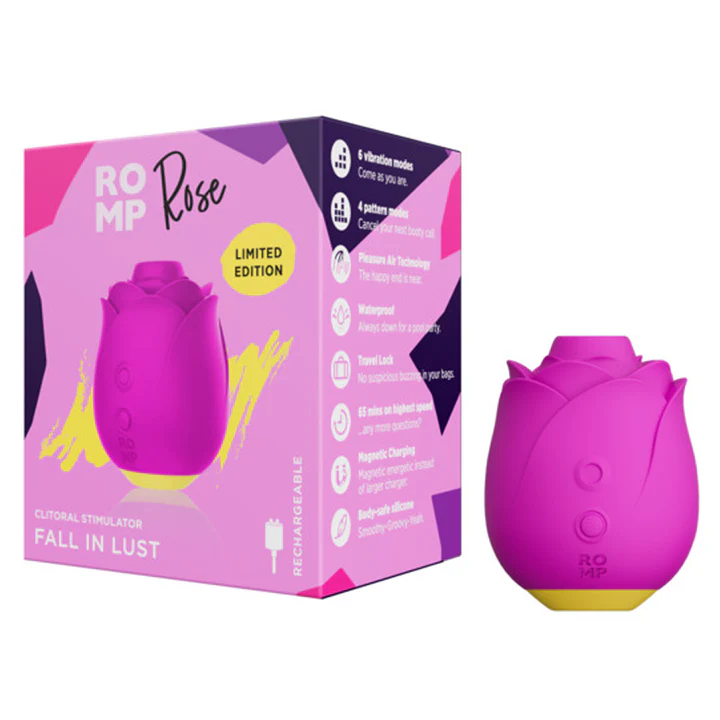 Rose by Romp: ROMP Rose is a unique clitoral stimulator with original Pleasure Air Technology, the groundbreaking suction-like sensation using waves of contactless air pressure. ROMP Rose’s extraordinary shape is designed to put orgasm front and center, with 6 intensities and 4 pattern modes, all in a high quality, rechargeable, silicone-coated toy at great price.